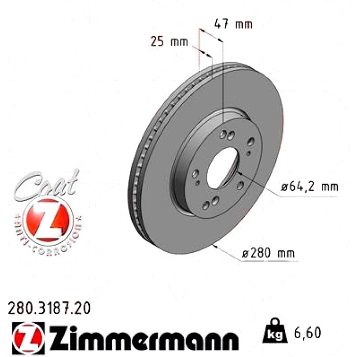 Передний тормозной диск Zimmermann 280.3187.20 на HONDA CIVIC IX Tourer (FK) с двигателем 1.8 i-VTEC (FK2) дата производства с 01.2014 по до н.в.