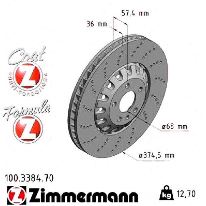 Передний тормозной диск Zimmermann Formula Z 100.3384.70 на AUDI A4 Avant (8W5, 8WD, B9) с двигателем RS4 quattro дата производства с 08.2015 по до н.в.