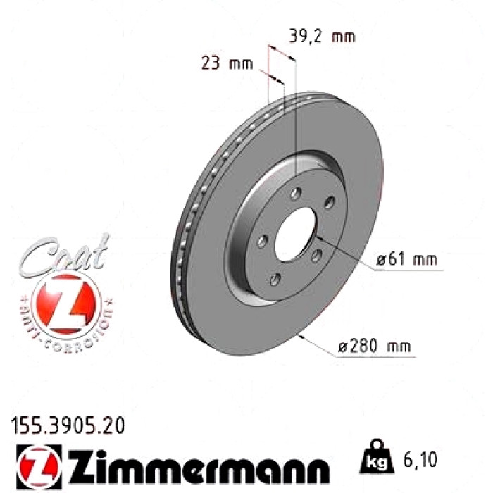 Передний тормозной диск Zimmermann 155.3905.20 на CHRYSLER PT CRUISER (PT_) с двигателем GT 2.4 дата производства с 06.2000 по 12.2010