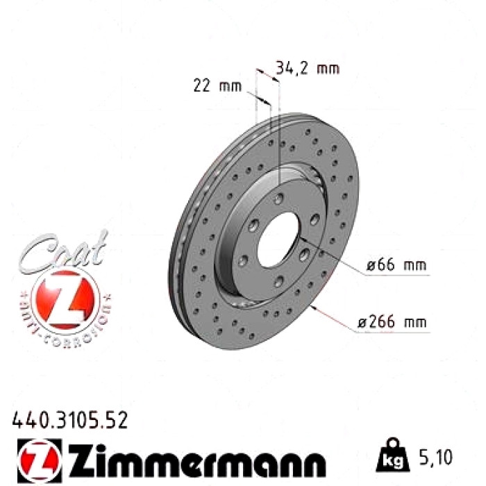 Спортивный передний тормозной диск с перфорацией 266x22 на CITROËN BERLINGO / BERLINGO FIRST ФУРГОН (M_) с двигателем 1.6 16V (MBNFU) Zimmermann Sport Z 440310552
