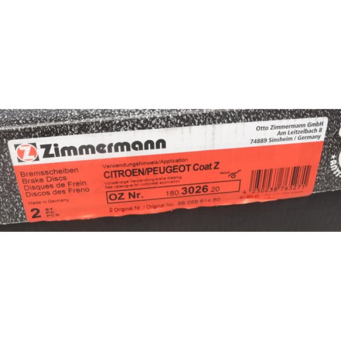 Передний тормозной диск Zimmermann 180.3026.20 на CITROËN C4 Grand Picasso II (DA_, DE_) с двигателем 1.6 HDi 90 дата производства с 06.2013 по до н.в.