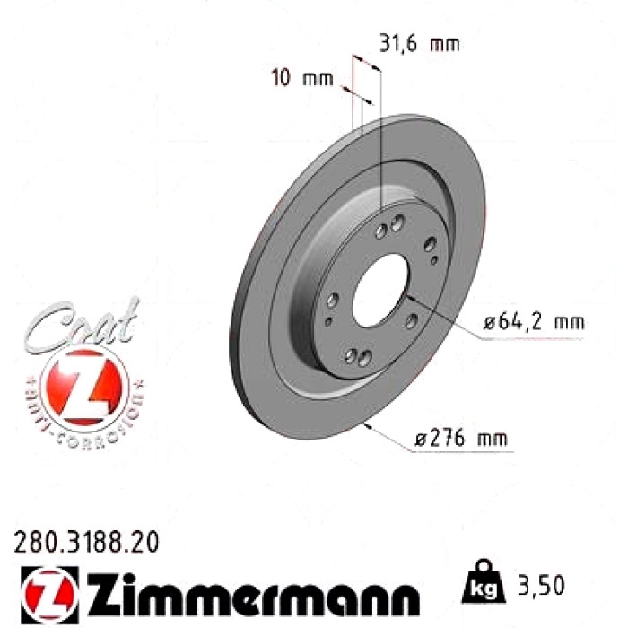 Задний тормозной диск Zimmermann 280.3188.20 на HONDA CIVIC IX Tourer (FK) с двигателем 1.8 i-VTEC (FK2) дата производства с 01.2014 по до н.в.