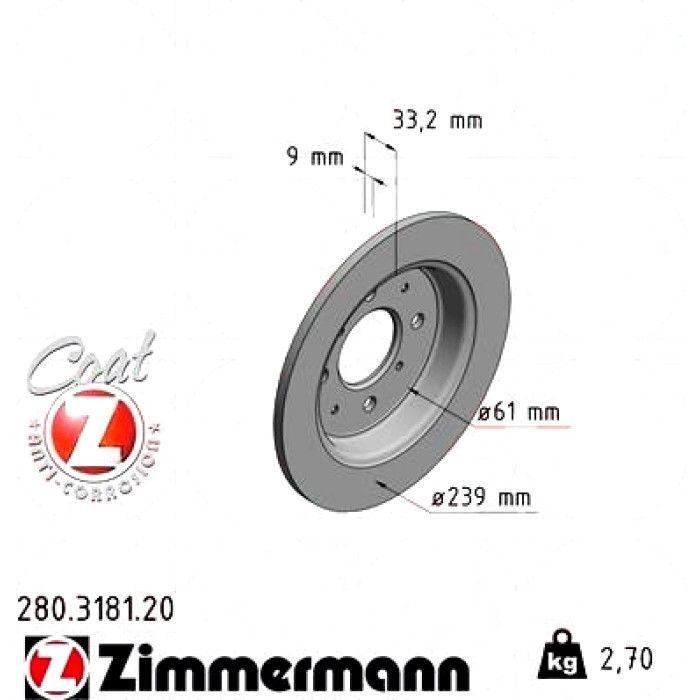 Задний тормозной диск Zimmermann 280.3181.20 на HONDA JAZZ IV (GK_) с двигателем 1.3 дата производства с 09.2013 по до н.в.