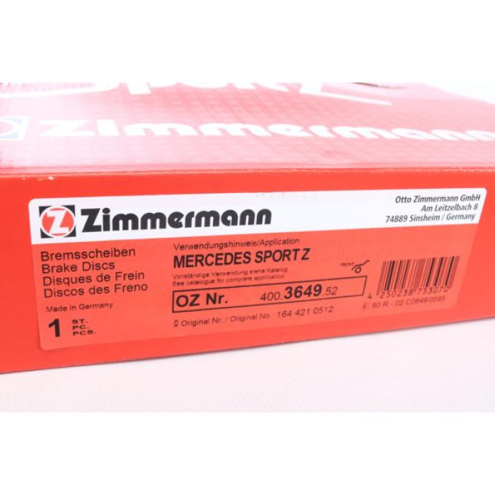 Спортивный передний тормозной диск Zimmermann Sport Z 400.3649.52 на MERCEDES-BENZ M-CLASS (W164) с двигателем ML 500 4-matic (164.172) дата производства с 02.2005 по 12.2012