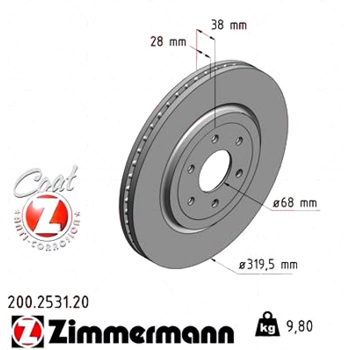 Передний тормозной диск Zimmermann 200.2531.20 на NISSAN NP300 NAVARA C БОРТОВОЙ ПЛАТФОРМОЙ/ХОДОВАЯ ЧАСТЬ (D40) с двигателем 2.5 dCi дата производства с 08.2008 по до н.в.