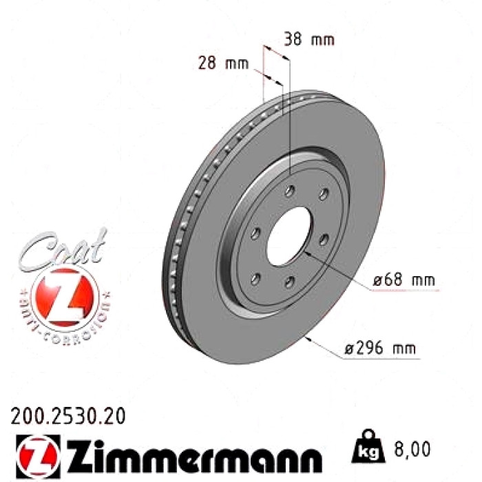 Передний тормозной диск Zimmermann 200.2530.20 на NISSAN NP300 NAVARA C БОРТОВОЙ ПЛАТФОРМОЙ/ХОДОВАЯ ЧАСТЬ (D40) с двигателем 3.0 dCi дата производства с 08.2008 по до н.в.